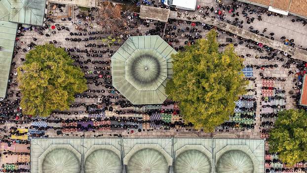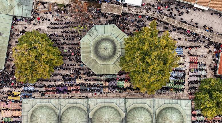 U Gazi Husrev-begovoj džamiji klanjat će se dženaza, odnosno molitva za pokojnog Halida Bešlića. Tu je donesen i njegov lijes. Mnogi građani Sarajeva su došli, što pokazuju i fotografije iz zraka...