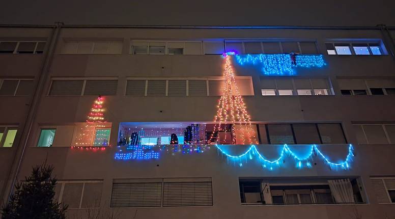 Prolaznici koji ovih dana šeću Srednjacima ne mogu ne primijetiti nesvakidašnji prizor. Umjesto klasičnih lampica na balkonu, ovi kreativni susjedi kreirali su pravu svjetlosnu instalaciju. Visoki svjetleći borovi protežu se preko prozora i balkona, a plave i bijele girlande povezuju različite dijelove fasade, ostavljajući dojam da cijela zgrada "diše" kao jedno.