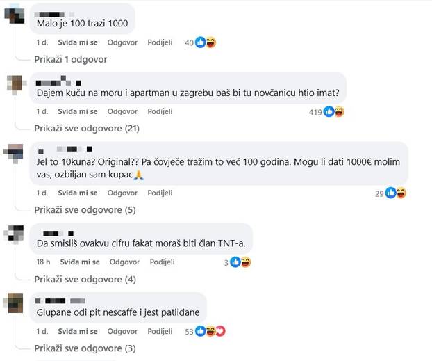 - Malo je 100 eura, traži 1000 eura - našalio se jedan komentator. 'Dajem kuću na moru i apartman u Zagrebu, baš bi tu novčanicu htio imat - sprdao se drugi pratitelj.
