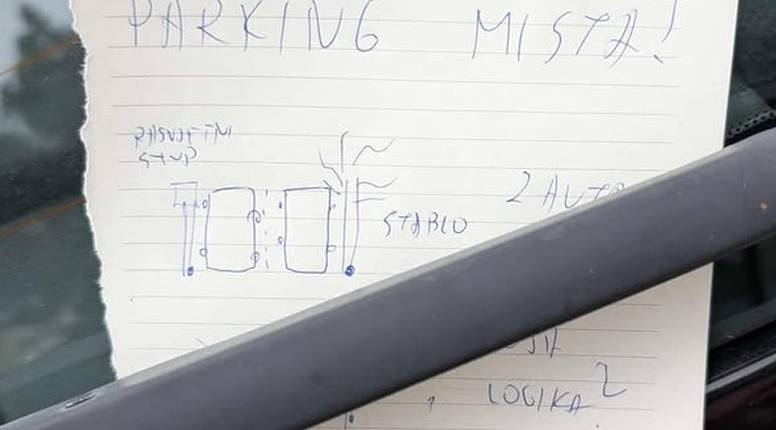 "Uzela si dva parking mista! Mlada si, gledaj okolinu i razmišljaj logično! Na ovom području ionako fali parking mista, poštuj stanare!", piše u poruci. A tu je i crtež za lakše snalaženje.