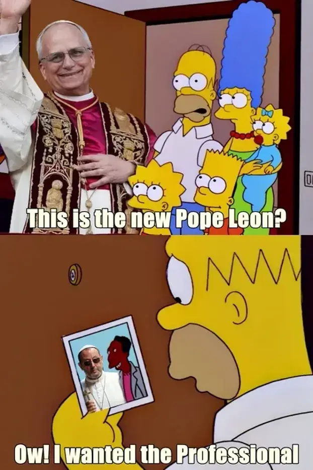 - To je novi papa Leone? Oh. Želio sam Léona Profesionalca - piše uz Homera Simpsona koji reagira na novog papu.
