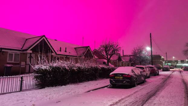 @khxdija.mrc Why is brum pink🤨 vid taken by ma cutey @Maryam🦢🌸 Pro videographer 😚😚 #birmingham #snow #pink #storm #fyp ♬ losing - Lonnex