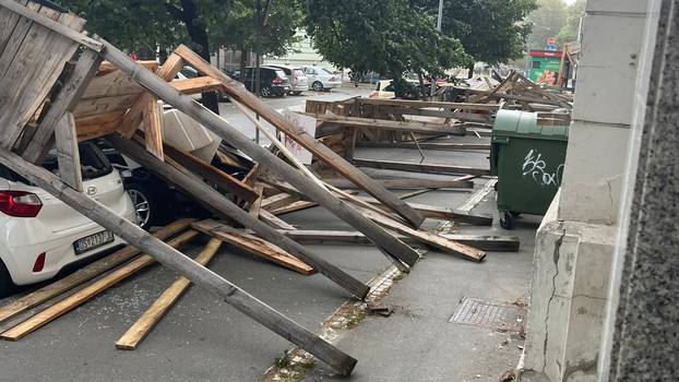 OSIJEK Velika drvena skela srušila se na aute parkirane ispred pošte u Osijeku. Vjetar je bio toliko jak da je čupao i bandere! DHMZ je za osječku regiju podigao stupanj opasnosti na najviši nivo - crveni. Ranije je nevrijeme napravilo kaos u Zagrebu gdje je rušilo drveće i oštetilo krovove