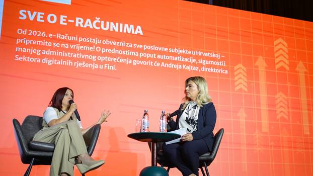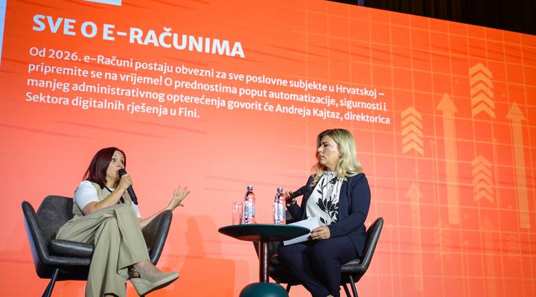 Od početka iduće godine papirnati računi postaju prošlost, a Fina pomaže poduzetnicima u toj tranziciji. O svemu tome razgovarale su jedan na jedan Andreja Kajtaz, direktorica Sektora digitalnih rješenja u Fini, i novinarka 24sata Snježana Krnetić na petoj biznis konferenciji Kvaka24, koja je bila 5. lipnja u hotelu Hilton Garden Inn. Ovogodišnja konferencija, pod nazivom "Šansa u svijetu globalnih promjena: Održivost i otpornost hrvatskog gospodarstva", dotaknula se tako i razmjena e-računa, koji početkom 2026. postaju zakonska obveza za sve poslovne subjekte u Hrvatskoj.