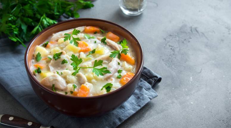 Poriluk ogulite, operite i narežite na tanke kolutiće. Mrkvu i celer narežite na manje komade. Pileća prsa narežite na kriške debljine jedan centimetar. U loncu otopite maslac i pirjajte poriluk, mrkvu, celer i nasjeckani luk oko 10 minuta. Dodajte toliko pilećeg temeljca da prekrije povrće pa zagrijte do vrenja. Zatim dodajte pileća prsa i poklopite. Kuhajte na srednje jakoj vatri oko 20 minuta dok se meso ne skuha. Izvadite piletinu i stavite je na tanjur te pokrijte folijom. U zdjelici pomiješajte vrhnje, škrob i žumanjak. Mješavinu dodajte u juhu i dolijte još temeljca. Miješajte dok se juha zgusne. Vratite piletinu u juhu, začinite sa soli i paprom pa kuhajte još nekoliko minuta na laganoj vatri.