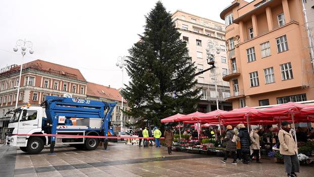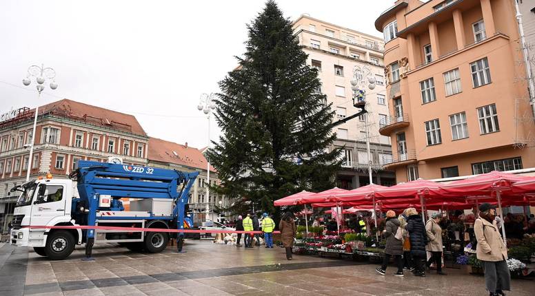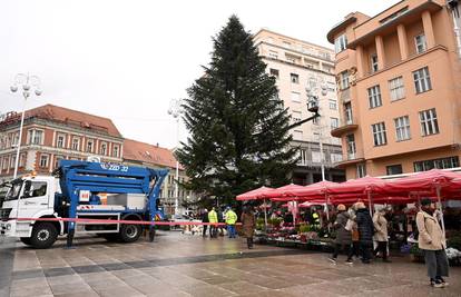 Radnici već marljivo ukrašavaju glavni božićni bor na Trgu bana Josipa Jelačića tisućama lampica, a osim njih, bor će biti okićen i šarenim mašnicama te zvončićima