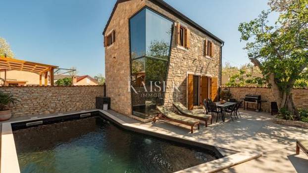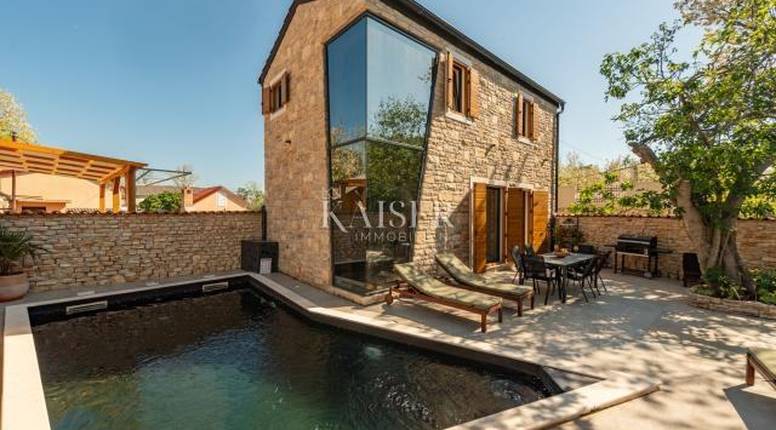Posebnu pažnju privlači grijani bazen sa sustavom slane elektrolize, zona za roštilj i stol za objedovanje na otvorenom, koji čine ovu vilu pravim mediteranskim rajem. Autentični kameni zidovi debljine 55 cm osiguravaju izvrsnu izolaciju.