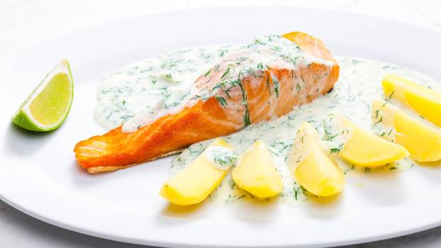 Ova kombinacija sočne ribe i aromatičnog umaka od kopra, limuna i bijelog vina stvara skladan spoj okusa koji podsjeća na mediteransku kuhinju. Priprema je brza i ne zahtijeva posebne kulinarske vještine. Poslužite uz kuhani krumpir ili laganu salatu. Najprije operite filete lososa te posolite i popaprite s obje strane. U tavi zagrijte maslinovo ulje i pržite losos 3 minute sa svake strane. Izvadite na tanjur i u istu tavu dodajte nasjeckani luk i pirjajte dok ne omekša. Zatim dodajte češnjak i pirjajte. Ulijte vino ili temeljac. Dodajte vrhnje i kopar te kuhajte par minuta dok se ne zgusne. Umiješajte limunov sok, vratite losos u tavu i kratko zagrijte u umaku. U slast!