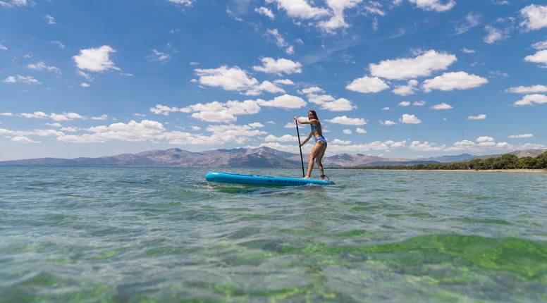 Jutro je najpouzdaniji trenutak za mirno more, dok maestral poslijepodne može podići sitne valove. Pratite prognozu vjetra, izbjegavajte otvorene dionice za vrijeme bure ili juga i planirajte povratak uz obalu. Obavezni su leash, prsluk za spašavanje i suha torba za osnovne stvari. Za više stabilnosti birajte nešto šire daske s dobrim gripom; modeli renomiranih brendova poput Aqua Marina nude dobar omjer stabilnosti, nosivosti i težine, a kvalitetna pumpa i pouzdano veslo skraćuju pripremu i čuvaju energiju za samu plovidbu. U sezoni računajte na povećan brodski promet i dodatno se držite unutrašnjih krakova uvala, dok izvan sezone imate tišinu i prostor gotovo samo za sebe.