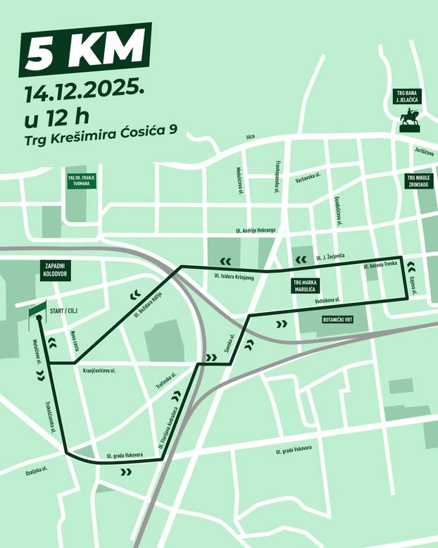 Ruta od 5 kilometara vodi sudionike kroz zapadni i središnji dio Zagreba. Startajući iz Metalčeve, trkači prolaze kroz Ozaljsku, Savsku, Vodnikovu, Gajevu i Baruna Trenka, pa dalje do Trga Marka Marulića, Ulice Isidora Kršnjavoga i Božidara Adžije, sve do cilja – natrag u Metalčevu ulicu.