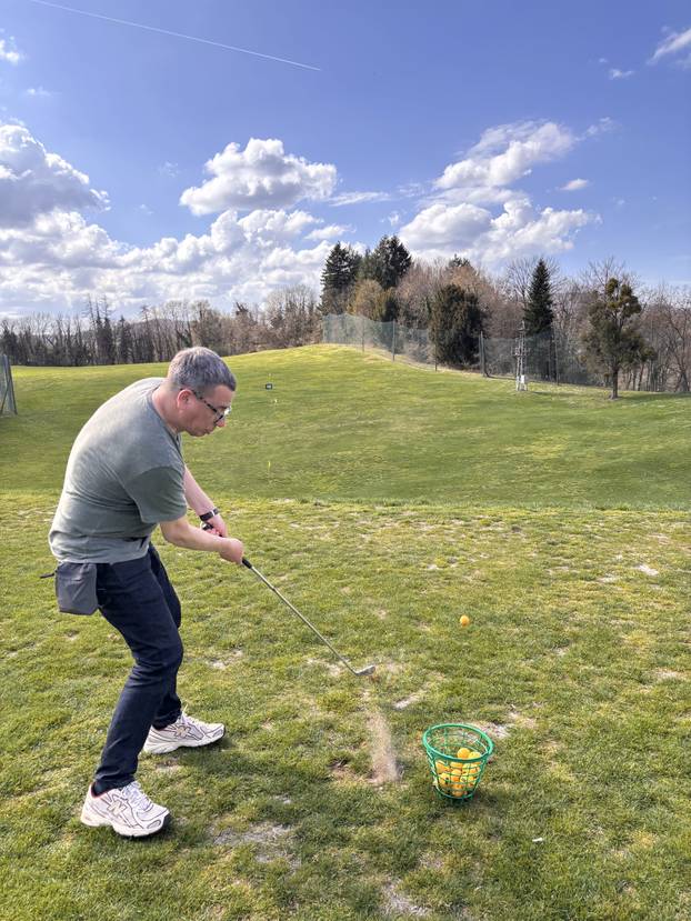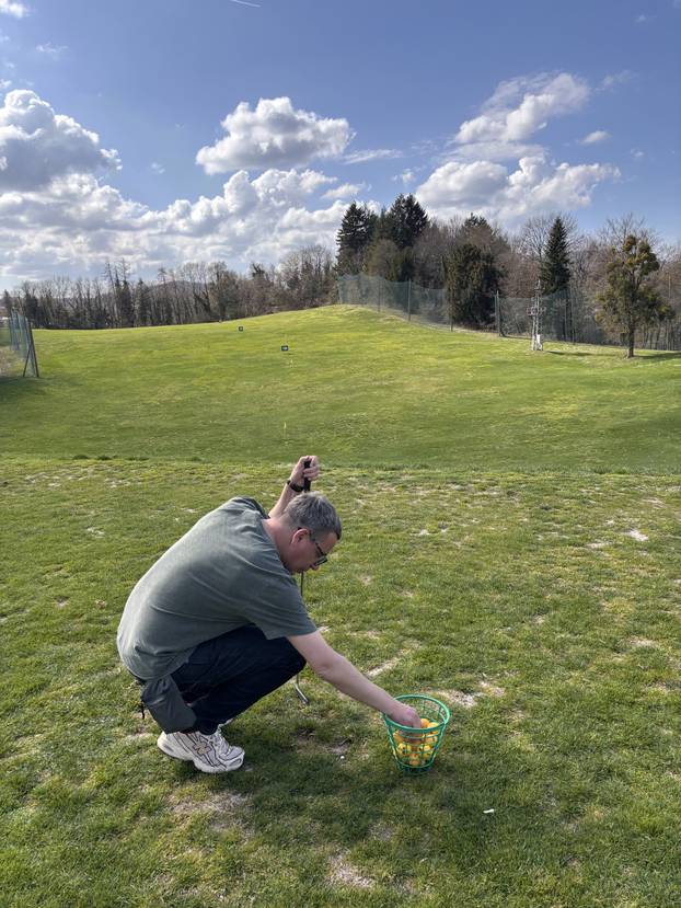 Sve je lijepo objasnio Mislav, rukom "izmjerite" udaljenost, ispravite se, lagano čučnete u koljenima, ne previše, i zamahnete, ali samo ramenima. Zvuči jednostavno, ali, vjerujte, i nije baš. Ručni se zglob sam od sebe umiješao u udarce, odnosno pokušaje. Buseni trave letjeli su na sve strane, zemlja i pijesak miješali su se u zraku, a loptica je mirno i spokojno bila na mjestu.