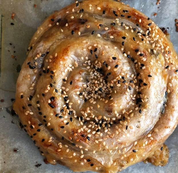 Stavite spiralu na lim za pečenje obložen papirom za pečenje. Ponovite s preostalim rižinim papirom i nadjevom kako biste oblikovali ukupno 4 pite. Pospite sezamom i pecite na 180°C oko 30 minuta ili dok ne porumene.