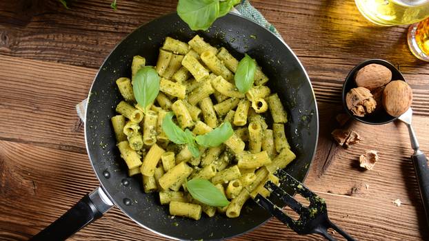 200 g mladog špinata, 20 g svježeg bosiljka, 30 g pinjola, žlica limunova soka, češanj češnjaka, 4 žlice maslinova ulja, 50 g parmezana, 500 g tjestenine, sol, papar