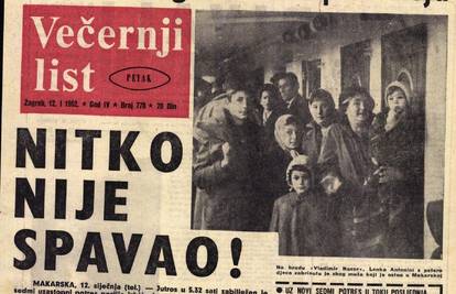 Nitko nije spavao!, naslov je vijesti na naslovnici Večernjeg lista na današnji dan 1962. godine u reportaži iz Makarske koju je pogodila serija potresa. U 5.32 sata zabilježen je sedmi uzastopni potres (prvi je zabilježen još 7. siječnja), a Makarska je već i prije toga nalikovala na napušteni stravičan grad. Najjači zabilježeni potres imao je snagu 8 stupnjeva Merkalijeve ljestvice.