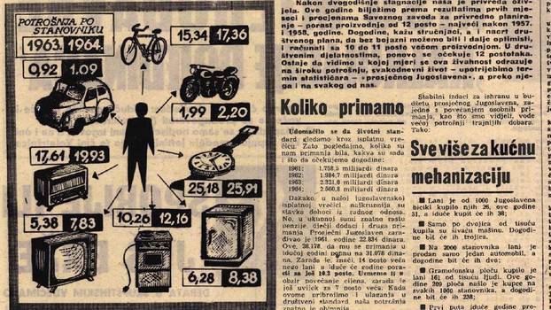 Iduća godina u brojkama, naslov je teksta u Večernjem listu od 19. studenog 1963. godine, u kojem se obrađuju statistički trendovi vezani za proizvodnju i potrošnju te projiciraju očekivanja razvoja tih trendova u 1964. godini. Ističe se da je privreda oživjela nakon dvogodišnje stagnacije. Tako se prema podacima Saveznog zavoda za privredno planiranje bilježi porast proizvodnje od 12 posto, najveći nakon 1957. i 1958. godine.