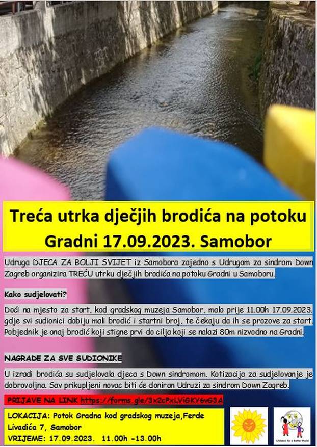 U nedjelju 17. rujna održat će se treća utrku dječjih brodića na potoku Gradni u Samoboru u kojoj aktivno sudjeluju i djeca s Down sindromom. Riječ je o događanju koje zajednički organiziraju Udruga 'Djeca za bolji svijet' iz Samobora i  Udruga za sindrom Down