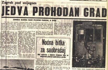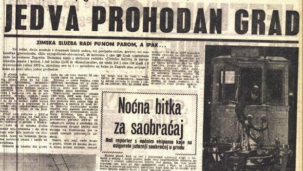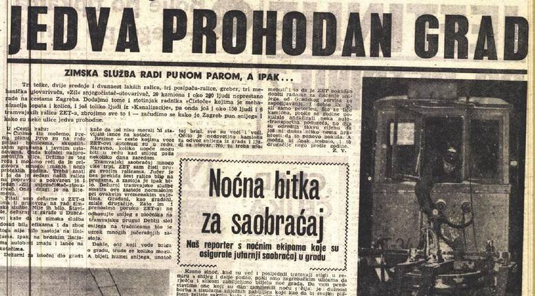 Tri teške, dvije srednje i čak 12 lakših ralica, tri posipača ralice, greber, tri mehanička utovarivača, "Zil" snjegočistač utovarivač, 20 kamiona i oko 200 ljudi neprestano rade na cestama u Zagrebu, piše Večernji list na današnji dan 1966. godine, nakon noći u kojoj je napadao snijeg i grad ostao paraliziran.