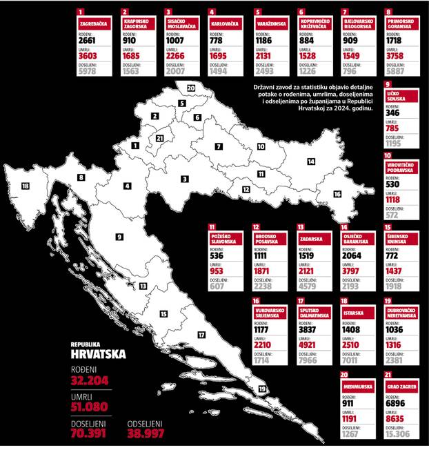 Što se rođenih tiče, njih je u 2024. godini bilo ukupno 32.204. Pogledamo li nekoliko godina unazad, vidljivo je da se broj rođenih smanjuje. Pa ih je, primjerice, 2021. bilo 36.641. S obzirom na ukupan broj stanovništva, ova je razlika prilično velika. A kako smo već napomenuli, lani smo imali i rekordnu brojku useljavanja u Hrvatsku. Ovdje se prošle godine iz inozemstva doselila 70.391 osoba, dok ih se izvan Hrvatske odselilo 38.997. Kako navode u DZS-u, u 2024. iz inozemstva se doselilo 18,9 posto hrvatskih državljana i 81,1 posto stranaca, dok se istodobno odselilo 51,7 posto hrvatskih državljana i 48,3 posto stranaca. Najviše ljudi došlo je u Hrvatsku iz Nepala, odnosno 14,2 posto od ukupnog broja doseljenih, te iz Bosne i Hercegovine (11,3 %). Što se tiče onih koji su otišli iz Hrvatske, najviše ih se odselilo u Njemačku (21,1 %).