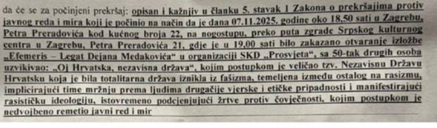 '...postupkom je veličao tzv. Nezavisnu Državu Hrvatsku, koja je bila totalitarna država izniknula iz fašizma, temeljena između ostalog na rasizmu, implicirajući time mržnju prema ljudima drugačije vjerske i etičke pripadnosti, i manifestirajući rasističku ideologiju, istovremeno podcjenjujući žrtve protiv čovječnosti, kojim postupkom je nedvojbeno remetio javni red i mir', piše na presnimku prijave.