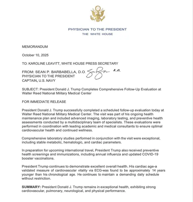 Trumpov osobni liječnik Sean P. Barbarella naveo je da predsjednik "ostaje u iznimnom zdravstvenom stanju", s vrlo dobrim kardiovaskularnim, plućnim, neurološkim i fizičkim funkcijama. Dodao je kako su laboratorijski nalazi bili "izvanredni" te da je Trumpova srčana dob otprilike 14 godina manja od njegove stvarne dobi. Ta procjena temelji se na elektrokardiogramu i naprednim analizama pomoću umjetne inteligencije.