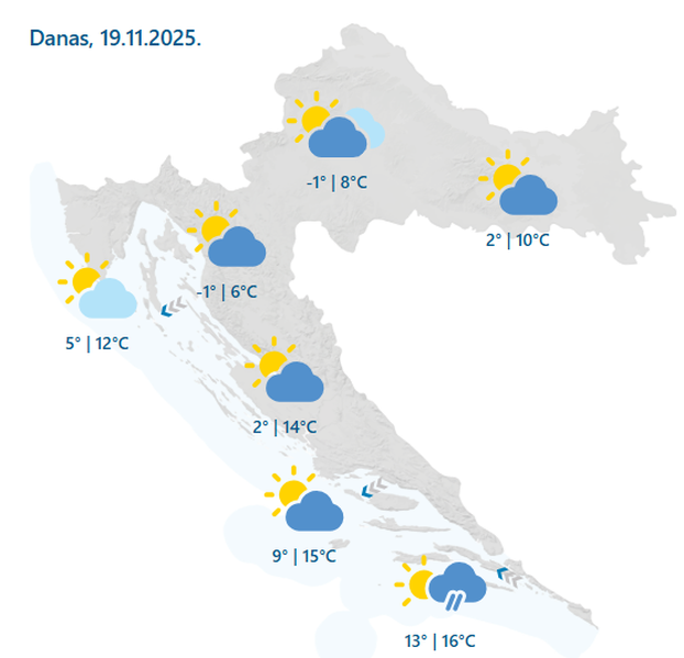 Temperature su jutros u kontinentalnom dijelu bile i ispod nule, a tijekom dana kretat će se u rasponu od 6 do 11 °C u unutrašnjosti, dok će duž obale biti nešto toplije, s najvišim dnevnim temperaturama između 12 i 17 °C. Zagreb će danas imati promjenljivo oblačno vrijeme sa sunčanim razdobljima, slab vjetar i najvišu dnevnu temperaturu između 6 i 8 °C.