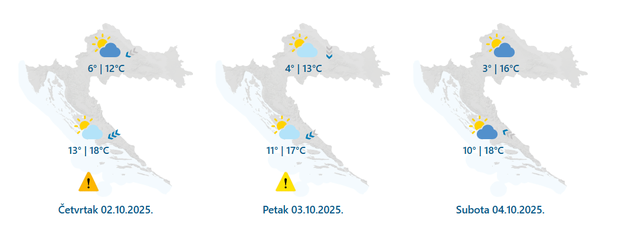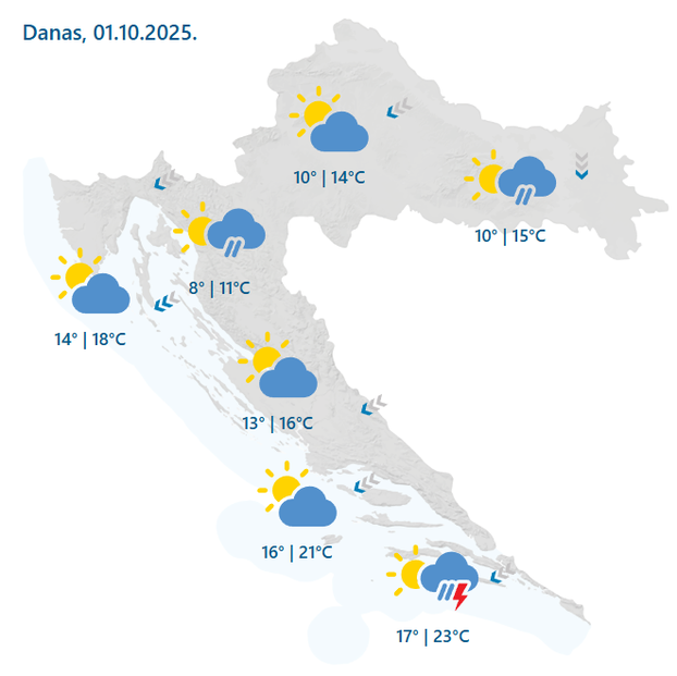 Prema prognozi Državnog hidrometeorološkog zavoda (DHMZ), u srijedu, 1. listopada, u većem dijelu zemlje očekuje se promjenljivo oblačno vrijeme sa sunčanim razdobljima. Ponegdje će pasti malo kiše, ponajprije u Gorskoj Hrvatskoj i na istoku, dok se na jugu u poslijepodnevnim satima može razviti i grmljavinsko nevrijeme.