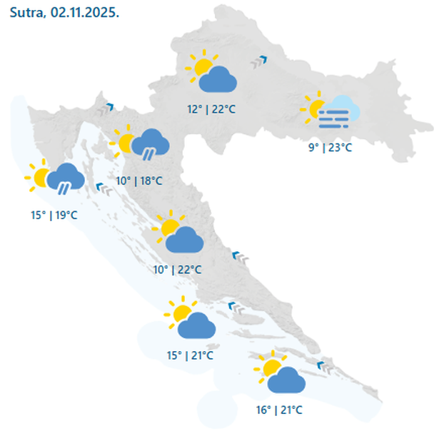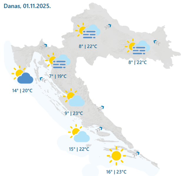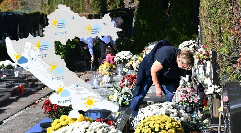 - Na istoku Hrvatske nakon jutarnje magle tijekom blagdana Svih svetih većinom sunčano, te mirno ili uz slabo do umjeren jugoistočni vjetar. Najniža jutarnja temperatura zraka od 7 do 10 °C, a najviša dnevna do 24 °C, što je za studeni neobično toplo. U mirnoj središnjoj Hrvatskoj pretežno sunčano te i dalje toplo kao rijetko kad u ovo doba godine. Ujutro od 8 do 12 °C, danju od 18 do 23 °C, ovisno o dugotrajnosti magle. A ako u vožnji svjetla uključite zbog magle, dobro će vam doći i poslije - zbog zakonske obveze. Na sjevernom Jadranu i u Gorskoj Hrvatskoj djelomice sunčano, ali u Rijeci i okolici bi povremeno mogla i padati kiša. Jutarnja magla u gorju ponegdje gusta. Vjetar slab do umjeren jugozapadni. Jutarnja temperatura zraka od 6 do 10 °C, na obali i otocima od 13 do 16 °C. Najviša između 16 i 20 °C. I u danju pretežno sunčanoj i toploj Dalmaciji ujutro u unutrašnjosti lokalno može biti magle. Vjetar slab, povremeno umjeren s mora, a more mirno i malo valovito. Ujutro temperatura zraka od 13 do 17 °C, u unutrašnjosti oko 9 °C, a najviša poslijepodnevna između 20 i 23 °C. Podjednako toplo i na krajnjem jugu Hrvatske, uz obilje sunčanog vremena. Povremeno umjeren zapadnjak, ujutro i burin koji će samo malo mreškati mirno more. U noći i ujutro gdjegod bi moglo biti magle, prognozirao je za HRT Izidor Pelajić, mag. phys.-geophys.