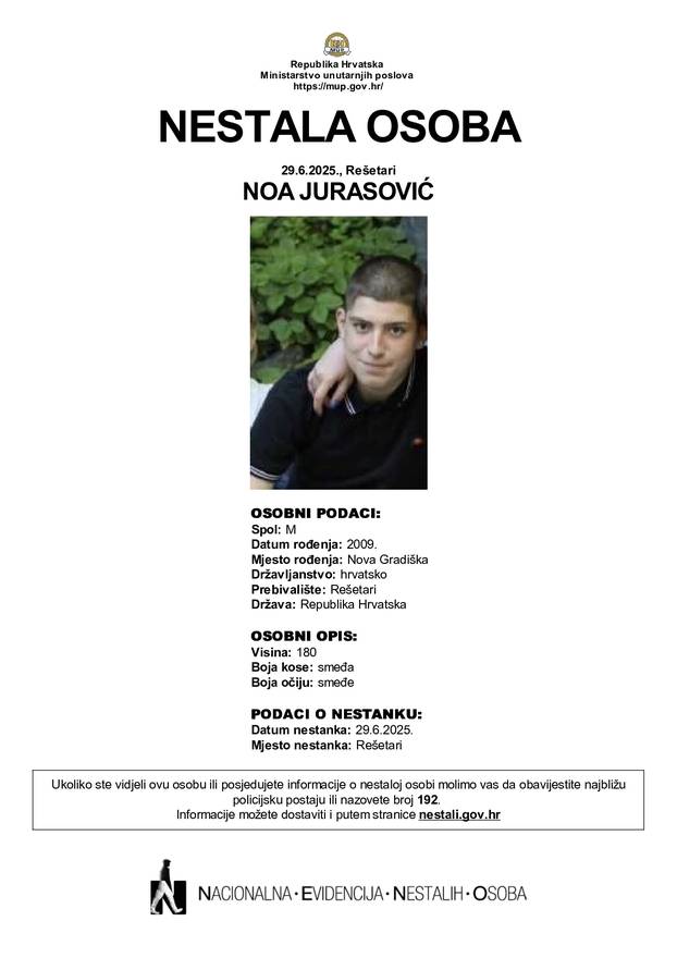 Noa Jurasović rođen je 2009. godine u Novoj Gradiški. Visok je 180 cm, ima smeđu kosu i smeđe oči, a u trenutku nestanka bio je odjeven u crne kratke hlače marke Adidas i crnu majicu s natpisom "Alpha". Nestanak je prijavljen Policijskoj upravi brodsko-posavskoj, a Noa se iz mjesta prebivališta u Rešetarima udaljio u nepoznato.