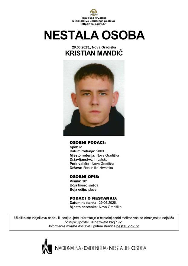 Kristian Mandić također je rođen 2009. godine u Novoj Gradiški. Visok je 181 cm, ima smeđu kosu i plave oči. U trenutku nestanka nosio je crne kratke hlače i crnu majicu kratkih rukava. On se iz svog prebivališta u Novoj Gradiški također udaljio u nepoznatom smjeru, a slučaj je prijavljen istoj policijskoj upravi.