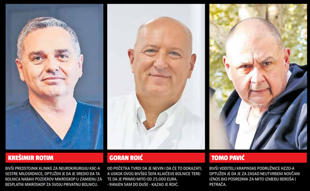 Za ovako veliku istragu i zločinačko udruženje, kažu nam upućeni, ovo je najbrže napisanih optužnica u povijesti Hrvatske. Petrača, Beroša i društvo se tereti da su se udružili u zločinačku organizaciju pod vodstvom Hrvoja Petrača kako bi u pet hrvatskih bolnica sredili da kupe skupe mikroskope, odnosno robote za neurološke operativne zahvate, baš od Pozderove tvrtke MIS, i pritom ih preplate. To im je uspjelo u tri bolnice, KBC Sestre Milosrdnice u svibnju 2022. godine, KBC Osijek u listopadu 2022. godine te Klaićeva bolnica u svibnju 2023. godine zbog čega je Roić, bivši šef Klaićeve, završio u istražnom zatvoru pod optužbom da je primio 25 tisuća eura mita, kao i Krešimir Rotim, koji je tad radio u KBC Sestre Milosrdnice. Za njega tužitelji ne vjeruju da je primio mito u novcu već da je dobio na poklon mikroskop vrijedan 115 tisuća eura za Specijalnu bolnicu Neurospine. Još prije dvije godine se spomenuta ustanova na društvenim mrežama pohvalila kako su prvi u Hrvatskoj dobili uređaj, nazvan Doktor Handy. Kako neslužbeno doznajemo, prenapredan je za trenutnu upotrebu, pa ga u KBC Sestre Milosrdnice i ne koriste. Sam Rotim se, kako neslužbeno doznajemo, branio da im skupi mikroskop nije bio dobar, pa su ga vratili, a navodno postoji i račun za taj uređaj, od 115 tisuća eura sa 100 posto popusta. Da stvar bude još bolja, iznos mita za pojedine aktere optužnice su skupa određivali Hrvoje i Novica Petrač, Hrvojev stariji sin.