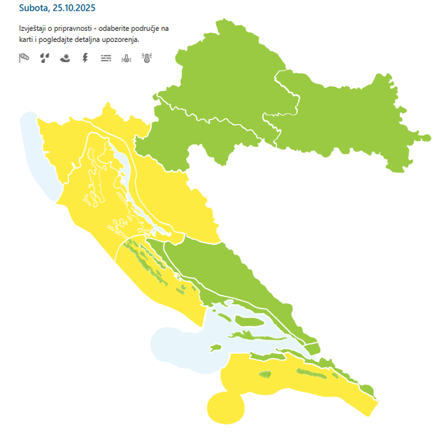Za ostatak zemlje, uključujući osječku, zagrebačku, splitsku i dubrovačku regiju, na snazi je zeleni meteoalarm, što znači da se ne očekuju opasne vremenske pojave.