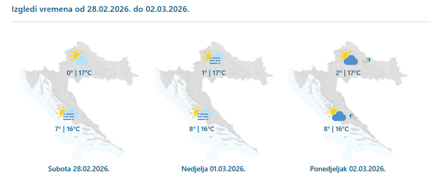 Vjetar će biti većinom slab, ponegdje u Slavoniji, Podravini i Međimurju slab do umjeren jugoistočni, a na Jadranu sredinom dana i popodne jugozapadni. Najniža jutarnja temperatura zraka bit će između -1 i 3, a na Jadranu od 5 do 10 °C. Najviša dnevna temperatura bit će većinom između 14 i 19 °C.