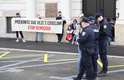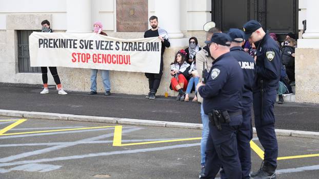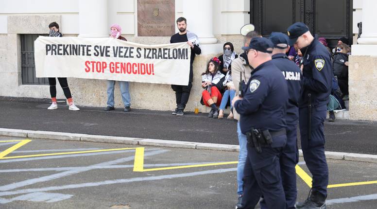 Dvadesetak aktivista okupilo se ispred zgrade Ministarstva vanjskih i europskih poslova na Zrinjevcu, tražeći prekid svih veza Hrvatske s Izraelom. Uz transparente poput "Prekinite sve veze s Izraelom! Stop genocidu" i povike "Free, free Palestine" i "Plenki, Plenki gdje se kriješ, genocidu ruku miješ!", blokirali su ulaz u zgradu. Interventna policija uskoro ih je odvela u postaju.
