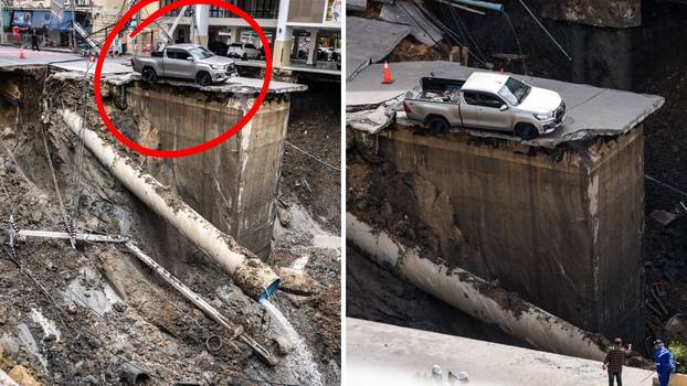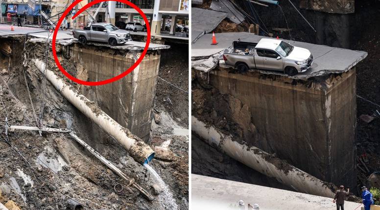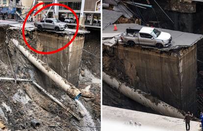 FOTO Je li ovo najsretniji čovjek na svijetu? Tajfun uništio cestu, auto ostao na rubu kratera!