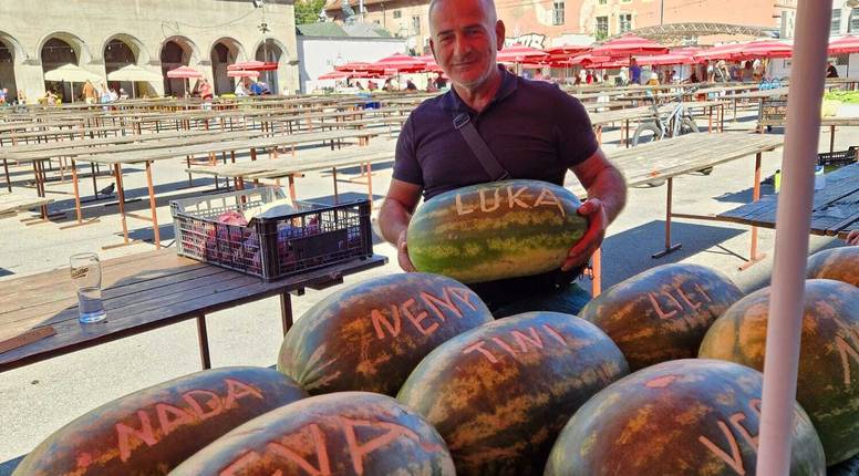 Tini Kasami (53), prodavač lubenica sa zagrebačkog Dolca, garantira da su baš njegove najslađe i najsočnije. A još će vam na njoj ugravirati i ime uz pomoć kovanice od jednog eura. Čekat ćete tri minute...