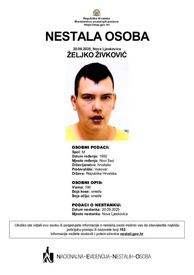 Policija i obitelj tragaju za Željkom Živkovićem (1992.) koji je nestao u subotu, 20. rujna 2025. godine, u Novoj Ljeskovici na području Požeško-slavonske županije. Živković se tog dana udaljio s adrese boravišta u nepoznatom smjeru i od tada mu se gubi svaki trag.