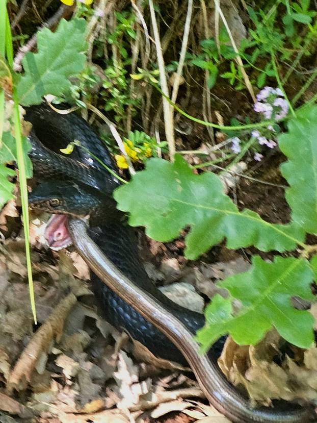 Šetala sam jutarnjim satima kad sam naišla na zmiju koja je jela sljepića. Bili su u jednom trenutku mirni, a kad sam htjela još jednom fotografirati, crna zmija je pobjegla, ispričala nam je čitateljica koja je zmije snimila u nedjelju u Istri.