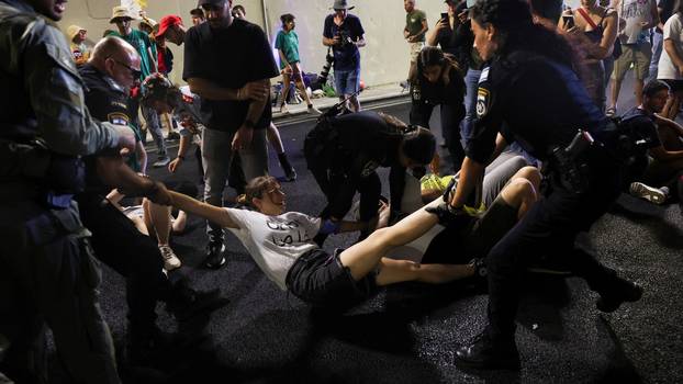 Prosvjednici su blokirali ceste diljem Izraela, uključujući i glavnu autocestu u Tel Avivu, mašući plavo-bijelim izraelskim zastavama i žutim zastavama koje simboliziraju solidarnost s taocima