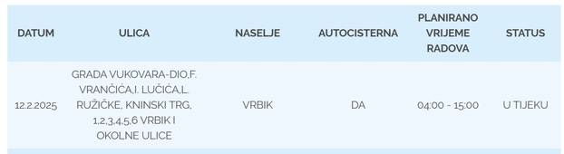 Bez vode je dio potrošača u Ulici grada Vukovara, Fausta Vrančića, Ivana Lučića, Lavoslava Ružičke, Kninski trg, Vrbik i okolnim ulicama, do 15 sati.