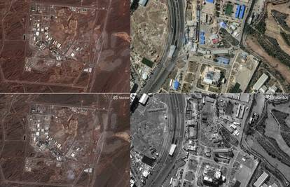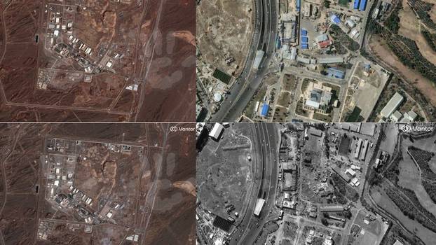 Ova kombinacija satelitskih fotografija prikazuje Sudski kompleks u Teheranu prije (lijevo) i nakon (desno) zračnih napada koje su izveli Amerikanci i Izraelci.