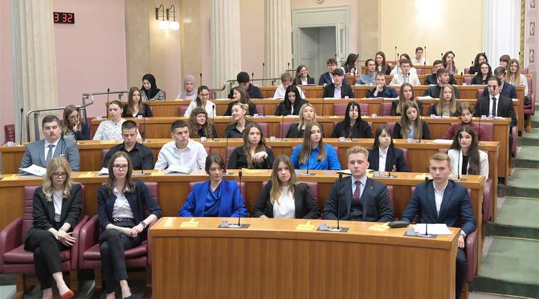 Na sjednici sudjeluje 160 učenika – zastupnika i dva učenika u ulozi tajnika i zamjenice tajnika simulirane sjednice