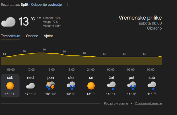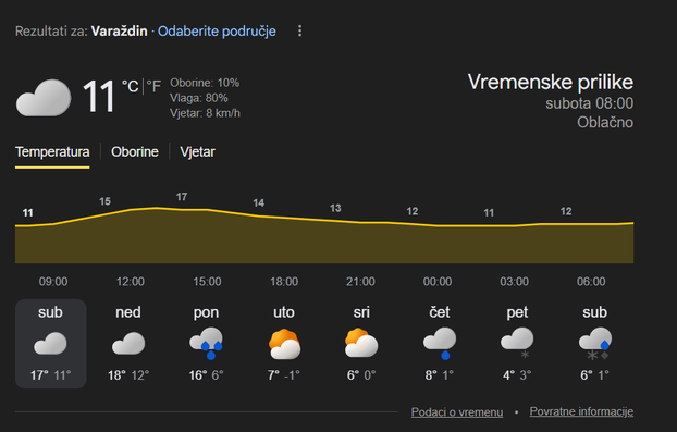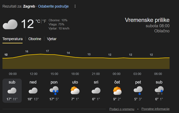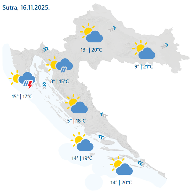 Temperature će biti iznadprosječno visoke za sredinu studenoga. Najviša dnevna temperatura zraka kretat će se od 15 do čak 20 °C, a u Zagrebu se očekuje oko 20 °C, dok će na Sljemenu biti nešto svježije, između 12 i 14 °C. Unatoč povremenim oborinama i magli, većinu zemlje očekuje ugodno toplo vrijeme za ovo doba godine, no svakako budite oprezni zbog jakog vjetra i smanjene vidljivosti u jutarnjim satima.