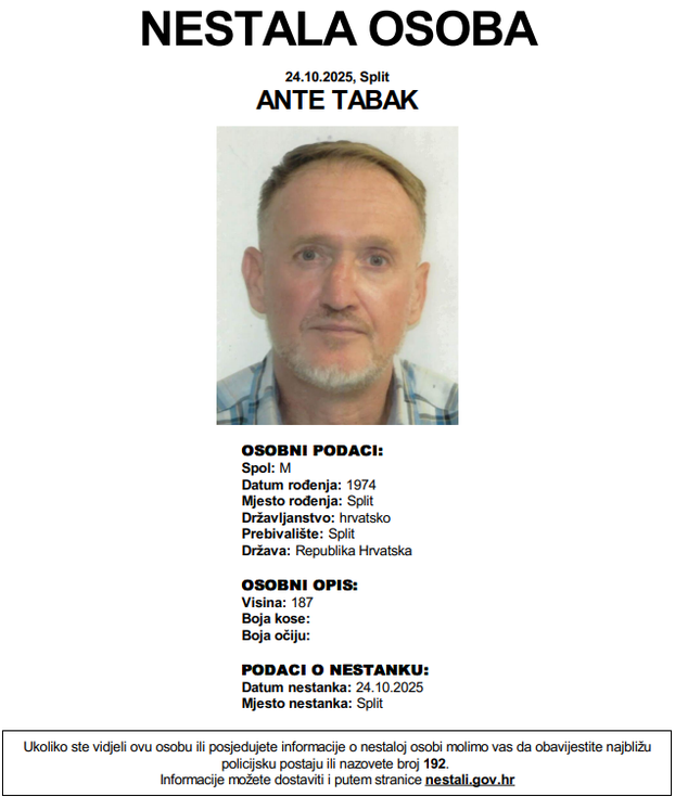 PU splitsko-dalmatinska objavila je informacije o Anti Tabaku (51), muškarcu koji je nestao 24. listopada u Splitu.
