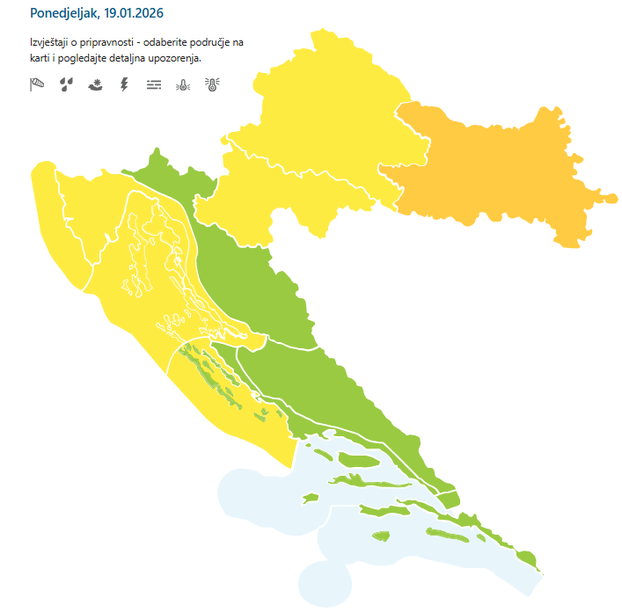 Za zagrebačku, karlovačku i riječku regiju izdano je žuto upozorenje zbog niskih temperatura. Na području Kvarnera i Kvarnerića na snazi je pak upozorenje zbog jake, mjestimice i vrlo jake bure, s udarima koji mogu dosezati i do 110 kilometara na sat.