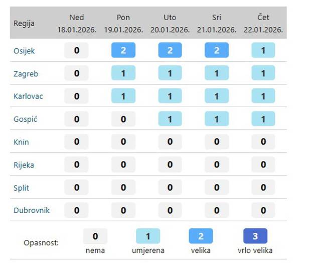 Zbog opasnosti koje niske temperature predstavljaju za zdravlje, DHMZ je aktivirao Meteoalarm za veći dio zemlje. Najviši, narančasti stupanj upozorenja na snazi je za osječku regiju, gdje se očekuju minimalne temperature niže od -8 °C. Iz DHMZ-a su poručili kako takve temperature mogu negativno utjecati na zdravlje, osobito kod starijih osoba, djece, kroničnih bolesnika i osoba bez odgovarajućeg smještaja.