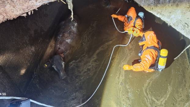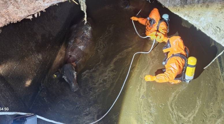 Prema fotografijama koje su objavili zatekli su životinju pri svijesti, no gotovo cijela je bila uronila u stajski gnoj. Samo joj je glava virila iznad, no situacija je bila itekako zahtjevna zbog brojnih otrovnih plinova koji su se ondje stvarali.