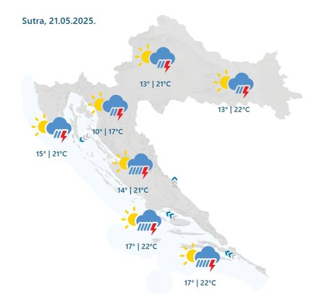 - Promjenjivo oblačno i nestabilno s povremenom kišom. Lokalno je moguća obilnija oborina te nevrijeme, osobito na jugu Hrvatske. Vjetar većinom slab južni i jugoistočni. Na sjevernom Jadranu će umjereno jugo već ujutro okrenuti na buru i istočnjak, zatim sjeverozapadni vjetar. U Dalmaciji umjereno i jako jugo popodne u okretanju na jugozapadnjak, a prema večeri će se sjeverozapadnjak proširiti duž cijele obale. Najniža jutarnja temperatura zraka 9 do 14, na Jadranu između 15 i 18 °C. Najviša dnevna od 20 do 23 °C, u gorju malo niža - stoji u prognozi DHMZ-a za srijedu, 21. svibnja.