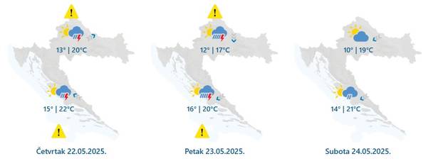 - Nestabilno i kišovito, a osobito s četvrtka na petak i u petak prijepodne lokalno moguća obilna kiša i nevrijeme. Već krajem petka smanjenje naoblake sa zapada. U subotu u većini krajeva djelomice sunčano i uglavnom suho, a još na jugu oblačnije s kišom. Slab do umjeren jugozapadni vjetar okrenut će na umjeren sjeverni i sjeveroistočni. Na moru umjereno jugo u petak u okretanju na buru, najprije na sjeveru. Na moru temperatura zraka bez izražene promjene, dok će u unutrašnjosti biti svježije - stoji u prognozi DHMZ-a za nastavak tjedna.