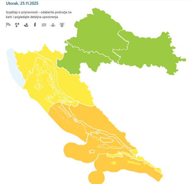 DHMZ je za utorak izdao narančasto upozorenje za kninsku i splitsku regiju zbog obilne i jake kiše. Za cijeli Jadran izdali su žuto upozorenje zbog jakog vjetra.