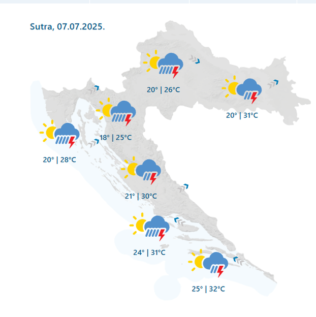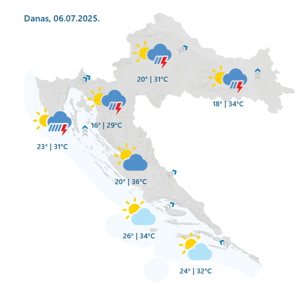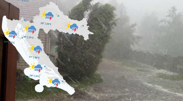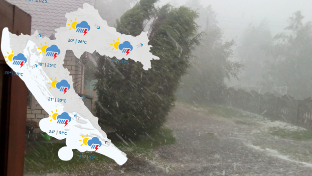 U većini države za danas stručnjaci najavljuju djelomice sunčano i nestabilno vrijeme. Od sredine dana mjestimice jači razvoj oblaka uz izraženije pljuskove i grmljavinu. Najveća vjerojatnost za grmljavinsko nevrijeme praćeno jakim i olujnim vjetrom je na sjevernom Jadranu te i u središnjim predjelima. U Dalmaciji će se zadržati sunčano. Zapuhat će umjeren do jak južni i jugozapadni vjetar, a na Jadranu i jugo. Najviša temperatura zraka od 29 do 34, u unutrašnjosti Dalmacije do 36 °C, javlja DHMZ.